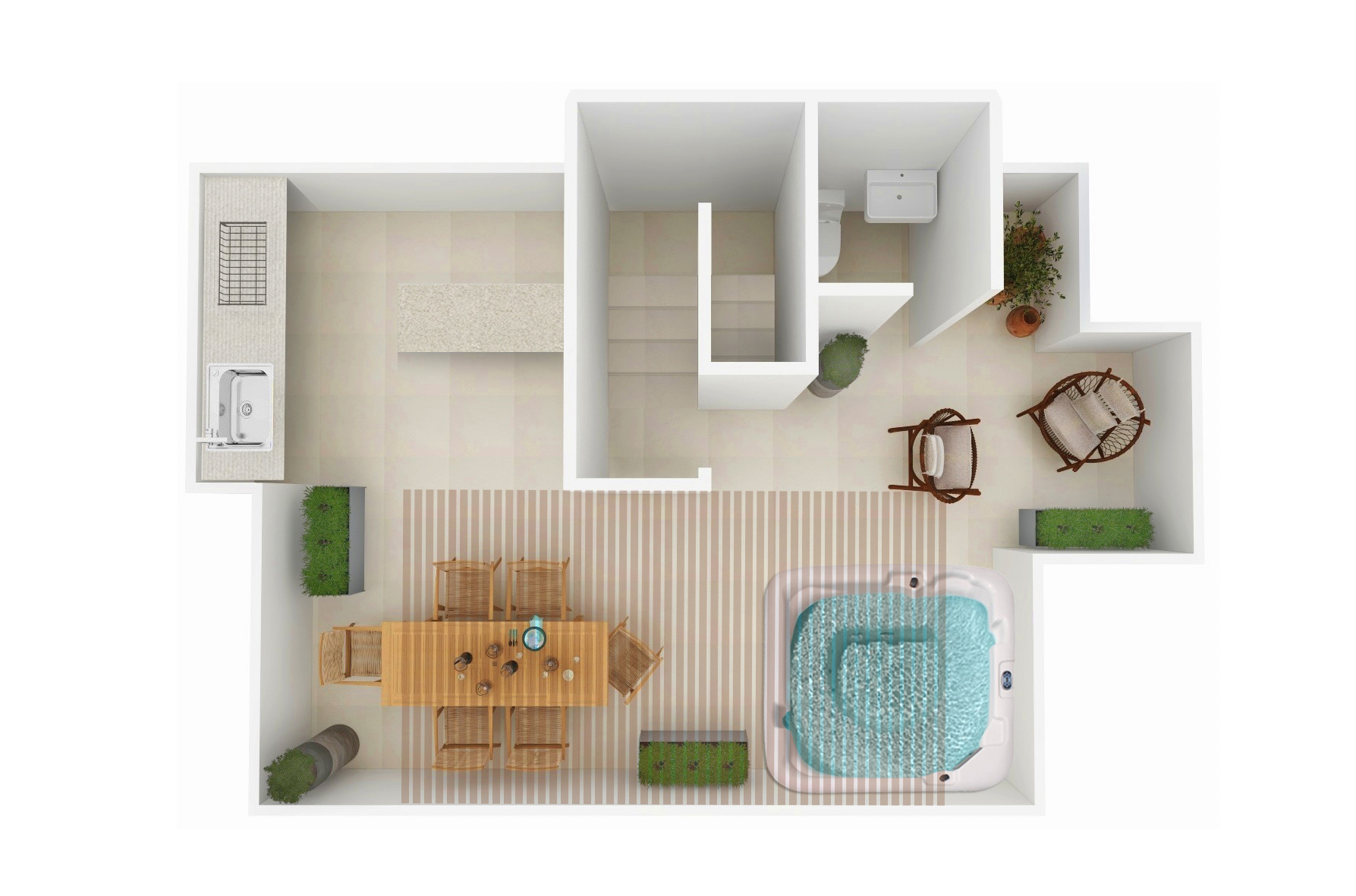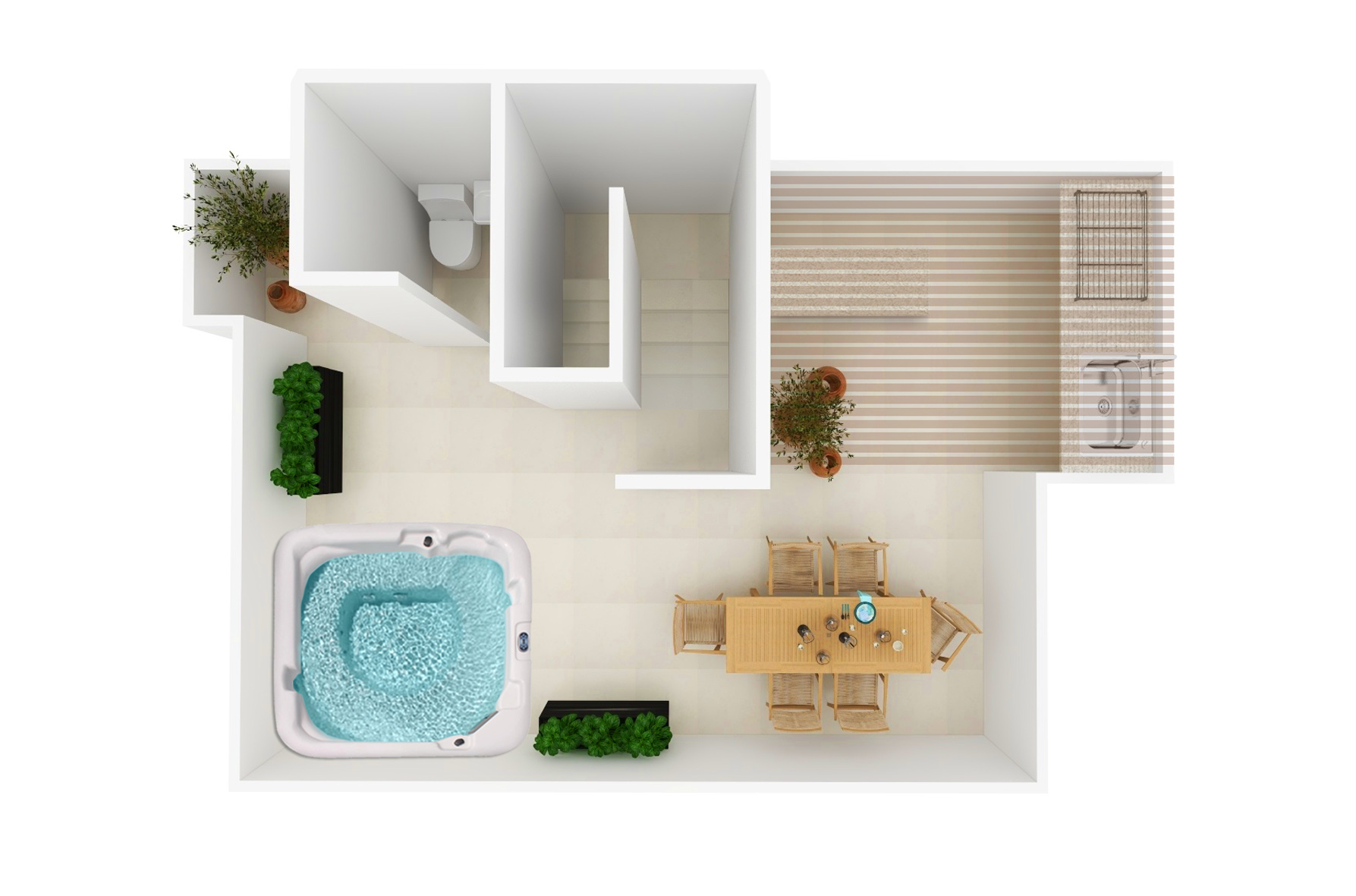 - Roof garden de 60 m2 con vista panorámica al bosque, equipado con jacuzzi, pérgola, asador y medio baño.